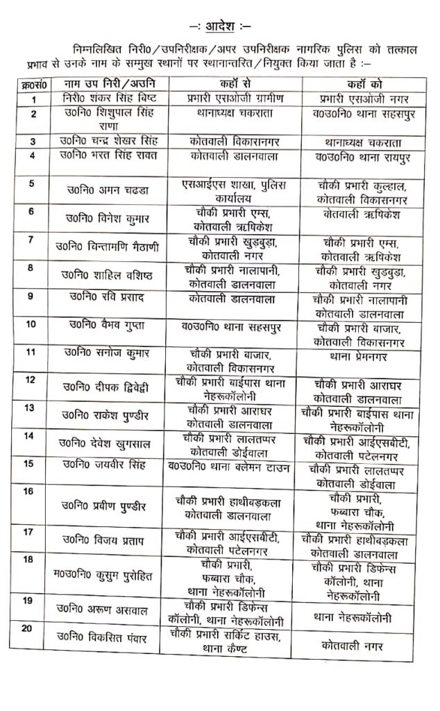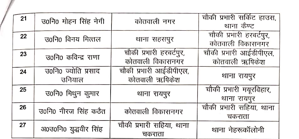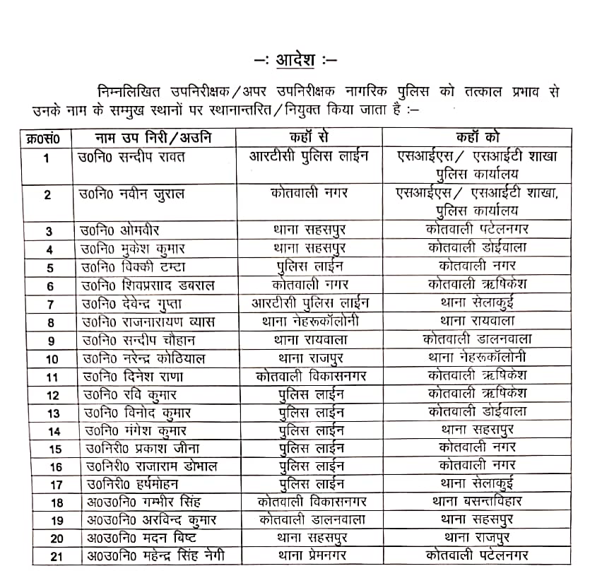 वरिष्ठ पुलिस अधीक्षक देहरादून द्वारा निम्न निरीक्षक/उप निरीक्षकों/अपर उप निरीक्षको के स्थानांतरण किए गए