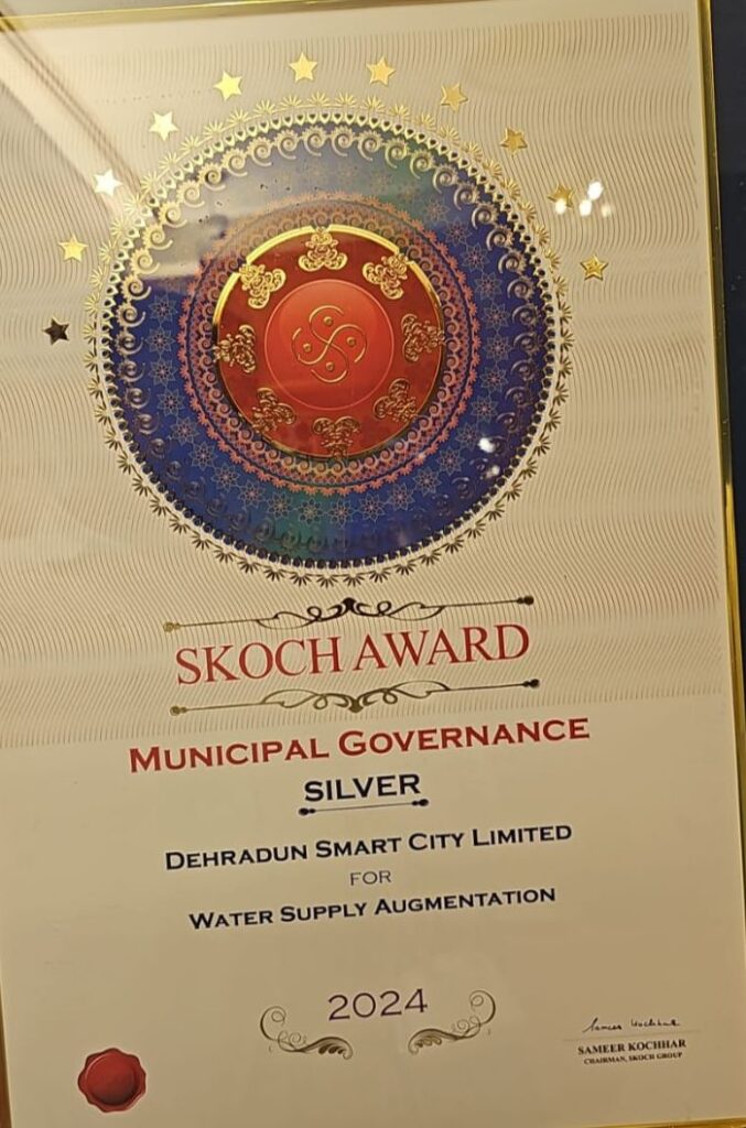 प्रणाली अध्यारोपण का कार्य किया गया है ।इस स्पर्धा में राष्ट्रीय स्तर के विभिन्न परीयोजनाओं की समीक्षा के उपरांत देहरादून स्मार्ट सिटी के द्वारा वाटर मैनेजमेंट कार्यों में पुरस्कार प्रदान किया गया है ।