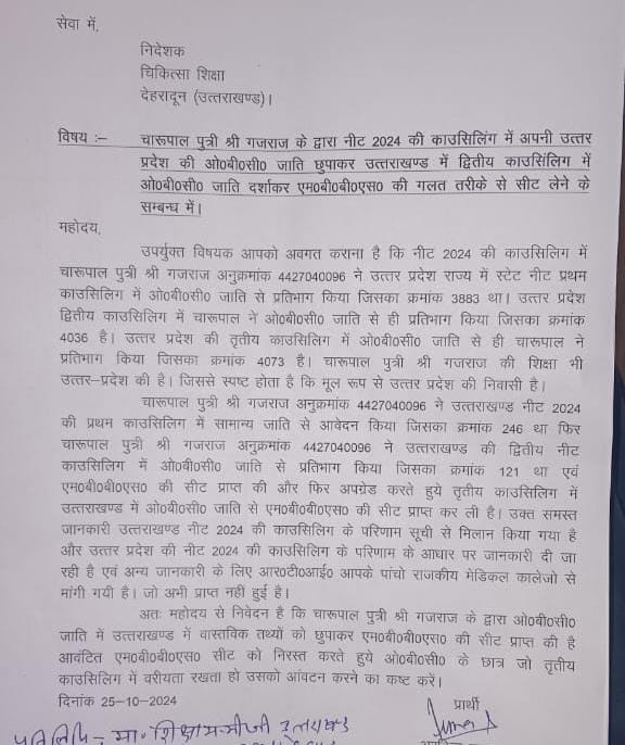 चारू पाॅल पुत्री गजराज ने यूपी नीट की तीन काउंसलिंग मे खुद को ओबीसी दिखाया है। वहां सलेक्शन नही हुआ तो उत्तराखंड आ गयी। यहां पहली काउंसलिंग मे खुद को समान्य दर्शाया। सलेक्शन नही हुआ तो दूसरी काउन्सलिंग मे कालागढ, कोटद्वार से ओबीसी का सर्टिफिकेट बनाकर उत्तराखंड मे सलेक्शन हो गया। दो- दो राज्यों का ओबीसी सर्टिफिकेट कैसे बन सकता है। इसमे अभ्यर्थी तो नपेंगे ही