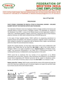 बी एन तिवारी ने बताया कि 14 फरवरी 2019 को जम्मू कश्मीर पुलवामा में आतंकवादी हमले में बलिदान हुए 40 सैनिकों के बाद भी फेडरेशन और बॉलीवुड ने पाकिस्तानी नायक नायिकाओं, गीतकारों, संगीतकारों और तकनीशियन्स का बहिष्कार किया था। उन्होंने कहा कि यदि केंद्र सरकार ने पुलवामा हमले के समय ही पाकिस्तान पर सैन्य हमला किया होता तो आज हमे पहलगाम में 27 निर्दोष हिंदुओं का नरसंहार नहीं हुआ होता। उन्हें प्रधानमंत्री द्वारा अटारी बॉर्डर बंद करने, सिंधु जल समझौता रद्द करने, पाकिस्तानी उच्चायोग बंद करने और भारत में रह रहे गैर हिन्दू पाकिस्तानी नागरिकों से 48 घंटे में भारत छोड़ने के निर्णय की प्रशंसा की। उन्होंने कहा कि पुलवामा नरसंहार का बदला इतनी सी कार्रवाई से पूरा नहीं होगा। भारत को पाकिस्तान पर सैन्य हमला करना और अखंड भारत में शामिल करना ही पाकिस्तानी आतंकवाद को समाप्त करने का एकमात्र फॉर्मूला है।