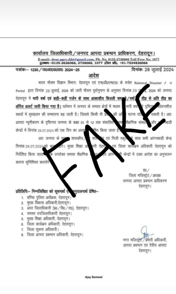 दिनांक 28 जुलाई 2024, विभिन्न सोशल मीडिया साइटों पर 29 जुलाई 2024 को कक्षा 1 से कक्षा 12 तक स्कूलों की 1 दिन की छुट्टी घोषित की जाने संबंधी आदेश प्रसारित किया जा रहा है, जबकि जिला प्रशासन द्वारा इस प्रकार का कोई आदेश दिनांक 29 जुलाई 2024 के लिए जारी नहीं किया गया है। विगत दिवस में जारी किए आदेश में छेड़छाड़ कर भ्रामक सूचना प्रसारित की जा रही है।