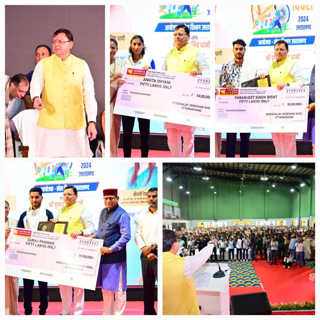 मुख्यमंत्री पुष्कर सिंह धामी ने गुरुवार को बहुउद्देशीय क्रीडा भवन, परेड ग्राउंड देहरादून में राष्ट्रीय खेल दिवस के अवसर पर आयोजित कार्यक्रम में सभी को खेल दिवस की शुभकामना दी तथा हॉकी के जादूगर के चित्र पर माल्यार्पण कर उन्हें श्रद्धांजलि अर्पित की। इस अवसर पर मुख्यमंत्री ने पेरिस ओलंपिक 2024 में प्रतिभाग करने वाले उत्तराखंड के 4 खिलाड़ियों ( लक्ष्य सेन, परमजीत सिंह, सूरज पंवार, अंकिता ध्यानी ) को 50 – 50 लाख की धनराशि के चेक प्रदान किये।