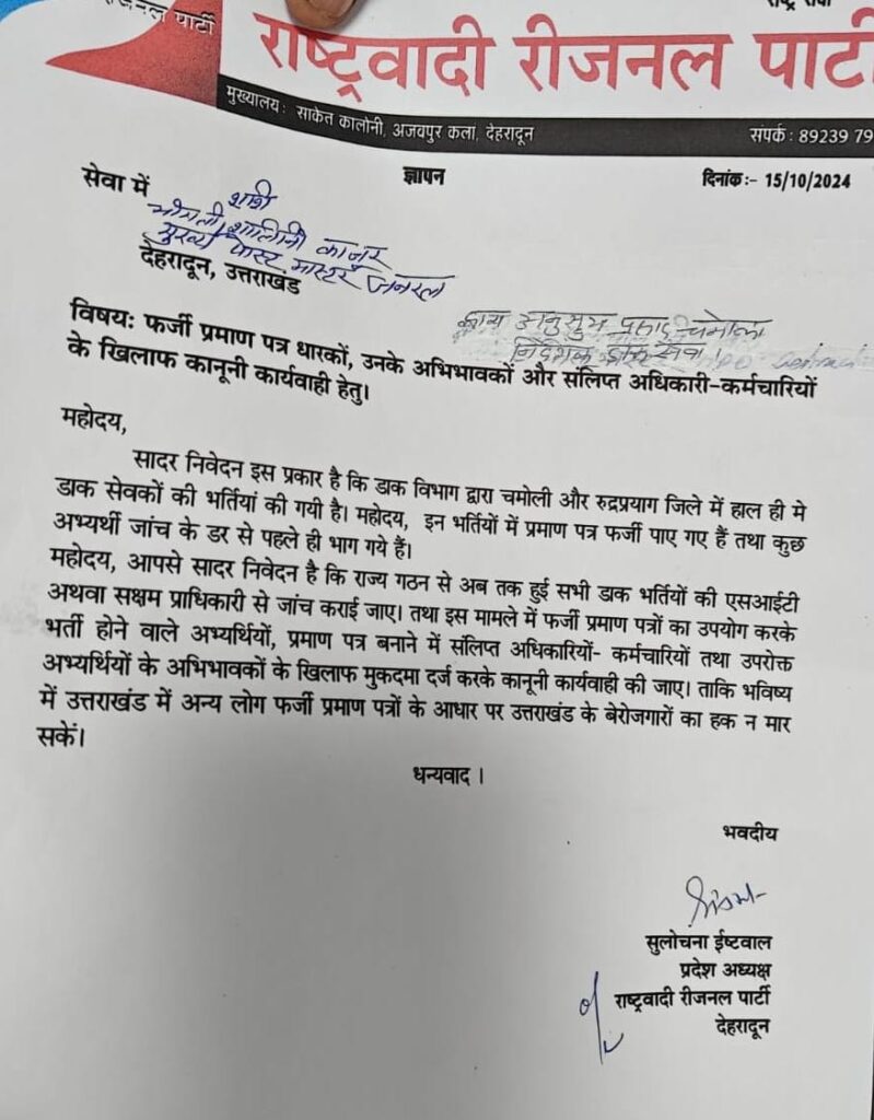 राष्ट्रवादी रीजनल पार्टी ने पोस्टल सर्विस डायरेक्टर अनुसुया प्रसाद चमोला से मिलकर फर्जी प्रमाण पत्रों के आधार पर डाक विभाग में नियुक्ति पाने वाले अभ्यर्थियों उनके अभिभावकों तथा फर्जी प्रमाण पत्र बनाने में संलिप्त अधिकारियों के खिलाफ मुकदमा दर्ज करने की मांग की है।