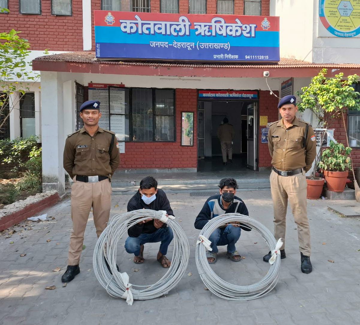 घटना के अनावरण तथा अभियुक्तों की गिरफ्तारी हेतु कोतवाली ऋषिकेश पर पुलिस टीम गठित की गई। गठित टीम द्वारा घटना स्थल के आस-पास आने जाने वाले रास्तों पर लगे सीसीटीवी कैमरों की फुटेजों का अवलोकन करते हुए संदिग्धों के सम्बन्ध में जानकारी एकत्रित की गयी तथा मुखबिर की सूचना पर चैकिंग के दौरान चौकी एम्स क्षेत्र से घटना में शामिल 02 अभियुक्तो *01: रवि चौधरी पुत्र वीरपाल तथा 02- यशू त्यागी पुत्र आनन्द प्रकाश त्यागी* को गिरफ्तार किया गया, जिनके कब्जे से घटना में चोरी किये गये एल्मुनियम के तार के बंडल बरामद किये गये।