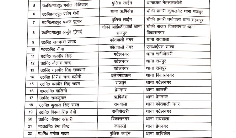 उ०नि० राजकुमार को ऋषिकेश से थाना प्रेमनगर, उ०नि० कुशाल सिह रावत को रायवाला से थाना कोतवाली नगर, उ०नि० बिक्रम सिह नेगी को रानीपोखरी से थाना पटेलनगर, उ०नि० नौशाद अंसारी को विकासनगर से थाना रायवाला,म०उ०नि० हेमा बिष्ट को कालसी से थाना प्रेमनगर, उ०नि० मनोज रावत व उ०नि० जगमोहन सिंह को पुलिस लाईन से थाना ऋषिकेश, उ०नि० देवेन्द्र कुमार गुप्ता को पुलिस लाइन से प्रभारी एएनटीएफ, म०उ०नि० प्रेरणा चौधरी को एएनटीएफ से रायपुर, उ०नि० बलदेव सिंह को एसआईएस शाखा से थाना पटेलनगर, म०उ०नि० भागीरथी को एसआईएस शाखा से थाना कोतवाली नगर, उ०नि०ना०पु० विवेक राठी को चौकी प्र० धर्मावाला थाना सहसपुर से चौ०प्र० आईडीपीएल थाना ऋषिकेश, उ०नि० ना०पु० मयंक त्यागी को चौकी बाजार विकासनगर से थाना क्लेमन्टाउन एवं म०उ०नि० ज्योति को थाना रानीपोखरी से थाना रायवाला स्थानांतरित किया गया है।