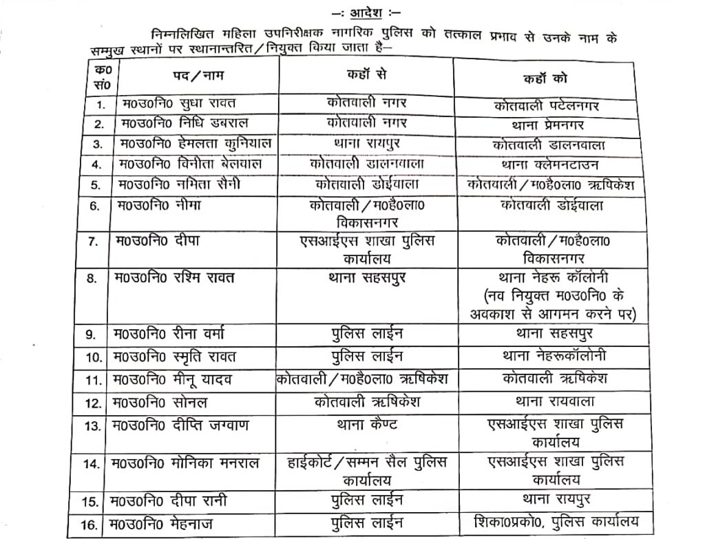आज दिनांक 11/10/2024 को वरिष्ठ पुलिस अधीक्षक देहरादून द्वारा महिला अधिकारियों के welfare का ध्यान और उनकी समस्या के दृष्टिगत 16 महिला उप निरीक्षक के कार्य क्षेत्र में परिवर्तन करते हुए निम्न स्थानांतरण किए गए।