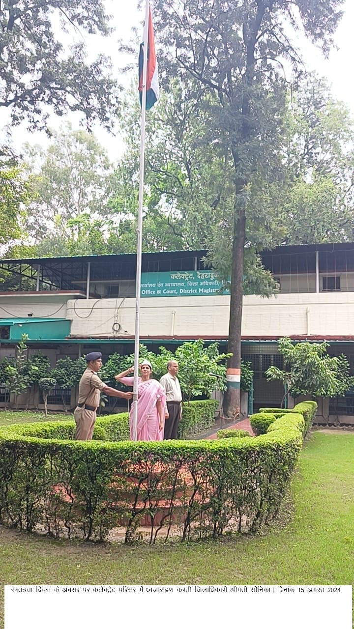 जिलाधिकारी श्रीमती सोनिका ने अधिकारी एवं कर्मचारियों के साथ ध्वजारोहण किया। जिलाधिकारी ने समस्त देश, राज्य एंव जनपद वासियों को स्वतंत्रता दिवस की शुभकामना दी। August 15, 2024devansh Comment देहरादून ,78 वें स्वतंत्रता दिवस के अवसर पर जिलाधिकारी श्रीमती सोनिका ने आज कलेक्टेªट परिसर में अधिकारी एवं कर्मचारियों के साथ ध्वजारोहण किया। [...]