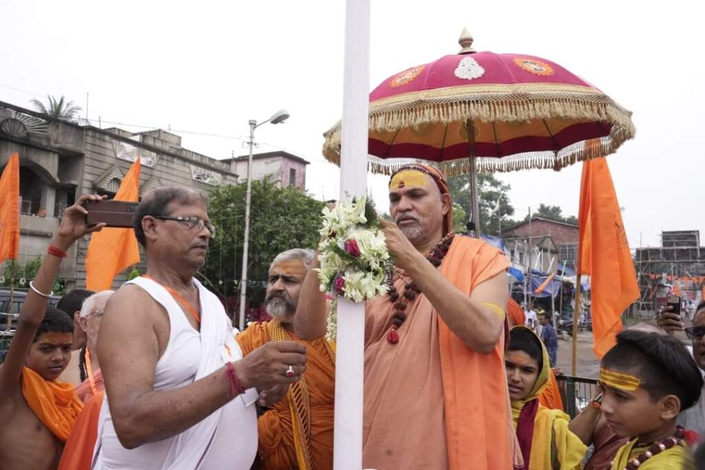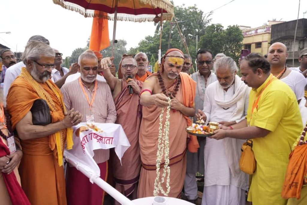 गोध्वज स्थापना भारत यात्रा के १२वें दिन आज आश्विन शुक्ल प्रतिपदा तदनुसार दिनांक ३ अक्टूबर २०२४ को पश्चिम बंगाल के प्रमुख महानगर हावडा के अति प्राचीन शंकरमठ में विधिविधान से पूजा करने के बाद परमाराध्य परमधर्माधीष उत्तराम्नाय ज्योतिष्पीठाधीश्वर जगद्गुरु शंकराचार्य स्वामिश्रीः अविमुक्तेश्वरानन्दः सरस्वती ‘१००८’ जी महाराज के कर कमलों से “गोप्रतिष्ठा ध्वज” को स्थापित किया गया ।